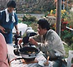 本日のお昼ご飯は、できたお茶を使います。お茶を作らないとお昼ご飯にならない?林屋先生の指導に従い、今回は釜入り茶の要領でお茶づくり。無事、緑茶になりました。 |