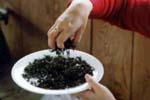 今回は、いよいよ「紅茶づくり」挑戦です。紅茶のプロ安藤友二先生に来ていただき、この季節紅茶づくりには無理があると言われながら無謀な試みをしてみました。 紅茶づくりは、摘んだ茶葉を一晩萎凋(自然乾燥)させなければなりません。このため、安藤先生が古背茶園と先生の奥さんが作られている茶園から昨日のうちに摘採してくれていました。萎凋させた葉は揉捻。茶葉の汁を出して酸化酵素が働きやすくします。 このあとは発酵です。しばらく時間がかかるので、古背茶園の様子を見に行きました。 そうこうしているうちに、発酵が進み、緑のお茶が紅茶の茶色に変化しています。仕上げは乾燥。なるべく手早く乾燥させねばなりません。電子レンジとヘアドライヤーを使ってひたすら乾燥。見事に、紅茶になりました。 長竹料理人の今日の料理は、紅茶を挽いてお抹茶にしたものです。結構なお手前でございました。 |